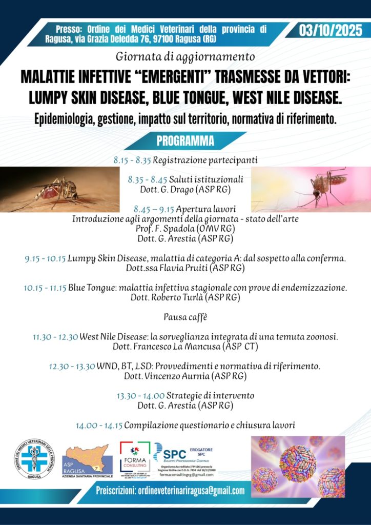 EVENTO FORMATIVO “MALATTIE INFETTIVE EMERGENTI TRASMESSE DA VETTORI: LUMPY SKIN DIDEASE, BLUE TONGUE, WEST NILE DISEASE. EPIDEMIOLOGIA, GESTIONE, IMPATTO SUL TERRITORIO, NORMATIVA DI RIFERIMENTO”. CON RILASCIO DI CREDITI SPC DEL 03 OTTOBRE 2025 DALLE ORE 08:15 ALLE ORE 14:15, PRESSO LA SEDE DELL’ORDINE DEI MEDICI VETERINARI DI RAGUSA.